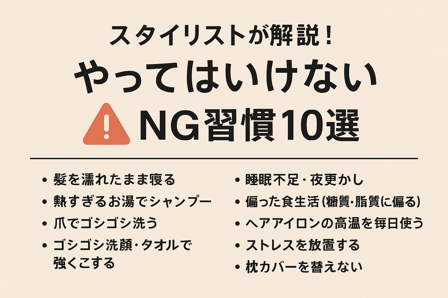 ヘアケア プロ目線!やってはいけないNG習慣10選 「毎日なんとなく続けている習慣が、実は髪や肌に大きなダメージを与えているかもしれません。 『髪がパサつく』『肌が荒れる』『なんだか老けて見える』―― その原因は、高価な化粧品やシャンプー不足ではなく、日常の“やってはいけない習... 2025.10.06 ヘアケア